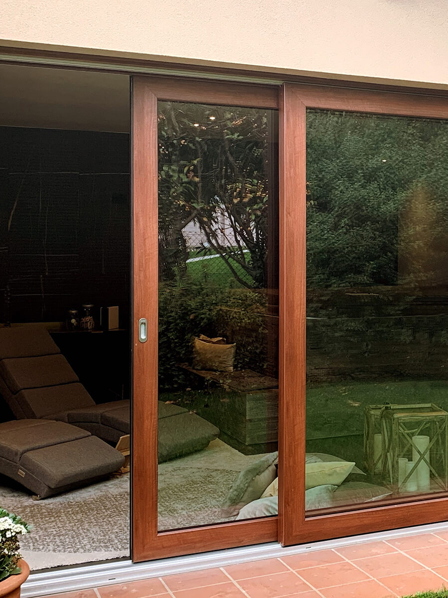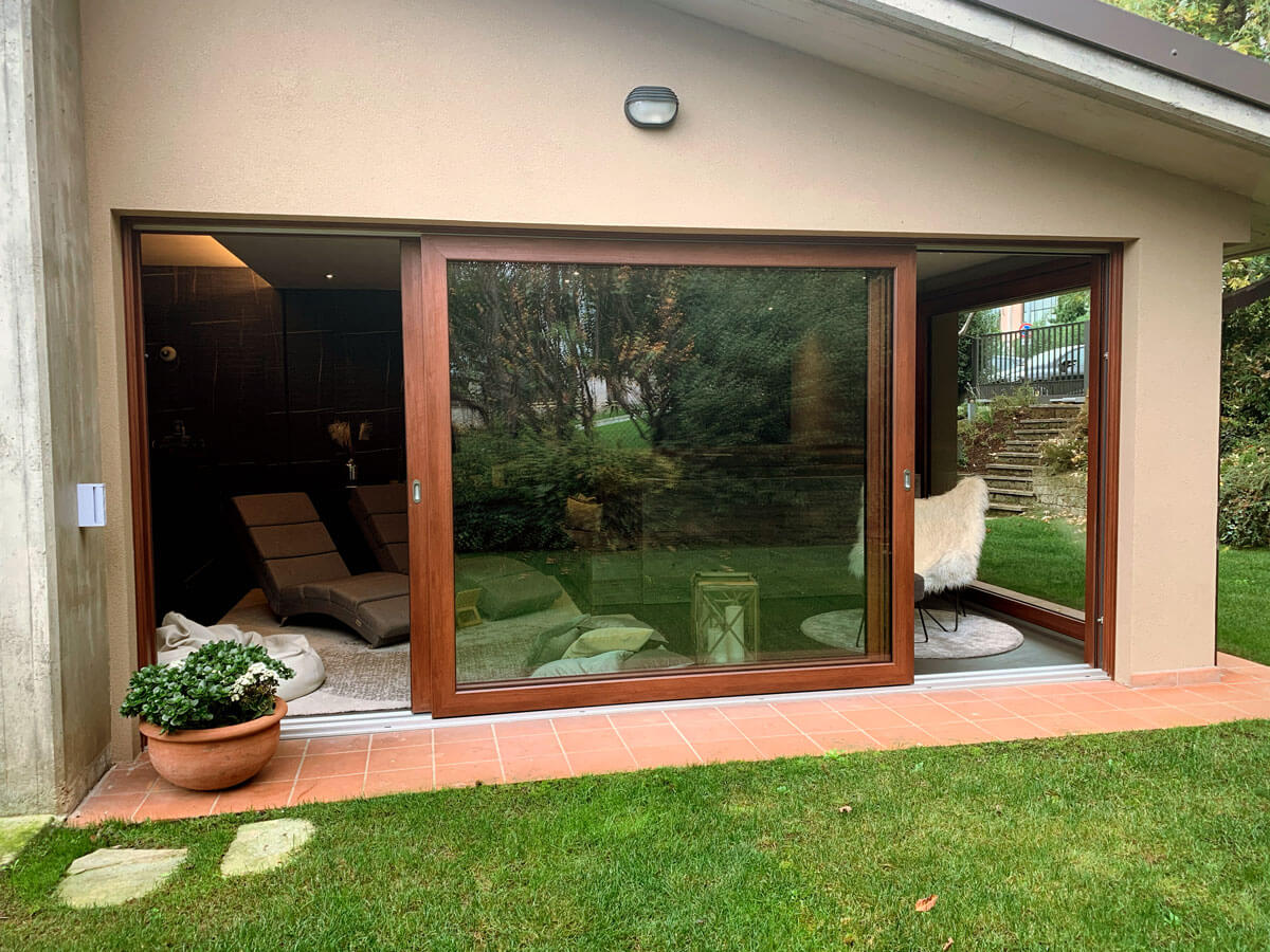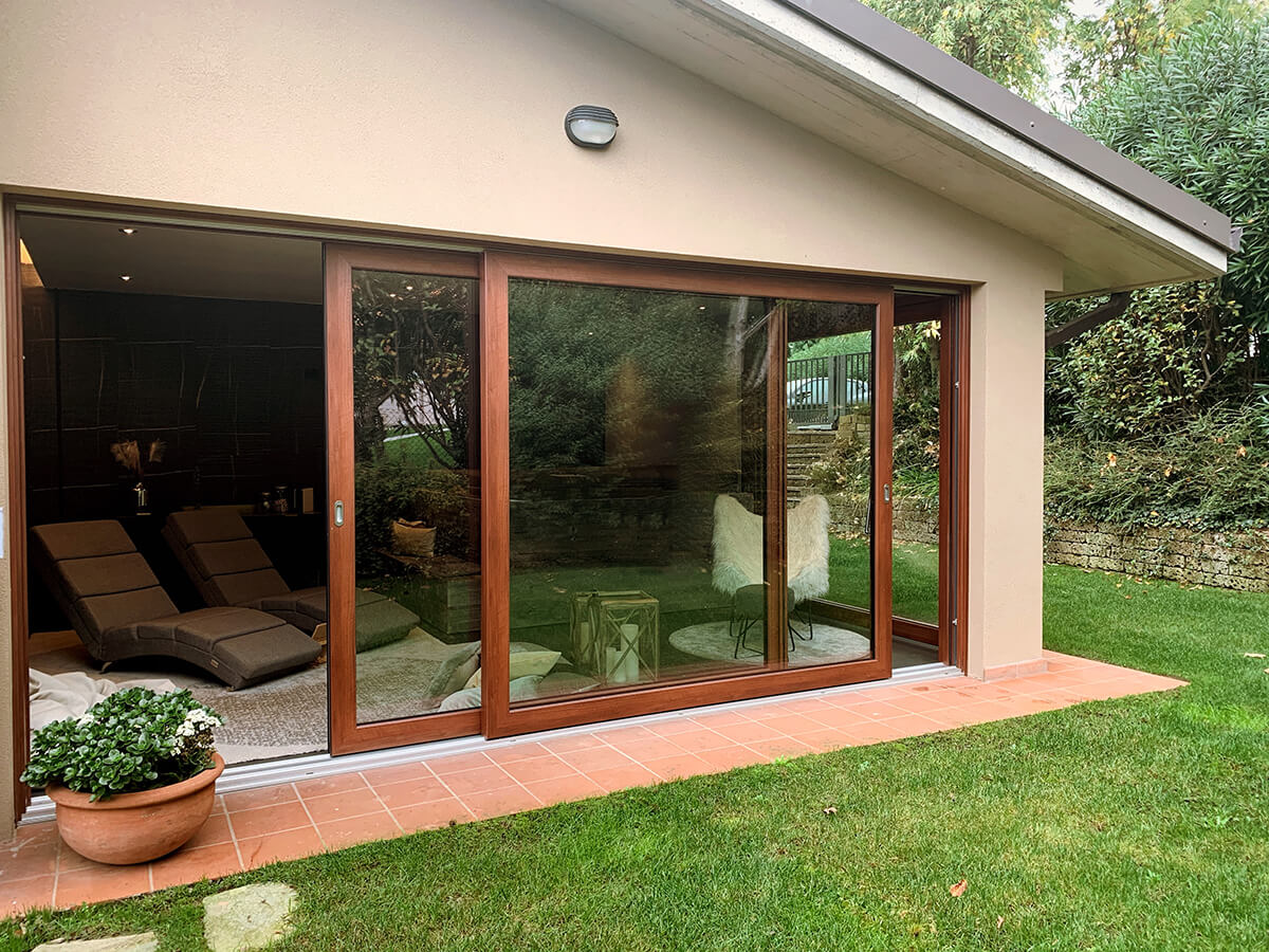 Il nostro cliente aveva una richiesta ben precisa: voleva creare un ambiente luminoso ed elegante per la sua area SPA. Voleva un ambiente che gli permettesse di avere luminosità e vedere la natura che lo circonda. Il nostro consiglio è stato quello di mettere degli Alzanti scorrevoli di Grandi dimensioni in PVC effetto legno.