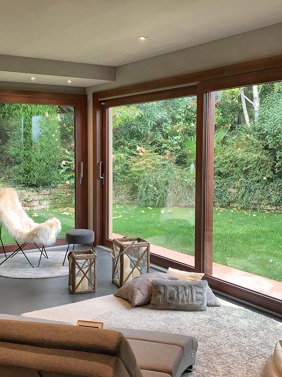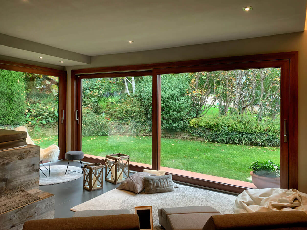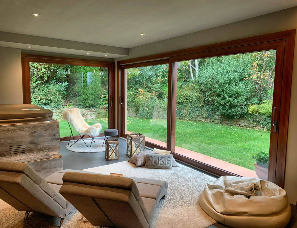 Il nostro cliente aveva una richiesta ben precisa: voleva creare un ambiente luminoso ed elegante per la sua area SPA. Voleva un ambiente che gli permettesse di avere luminosità e vedere la natura che lo circonda. Il nostro consiglio è stato quello di mettere degli Alzanti scorrevoli di Grandi dimensioni in PVC effetto legno.